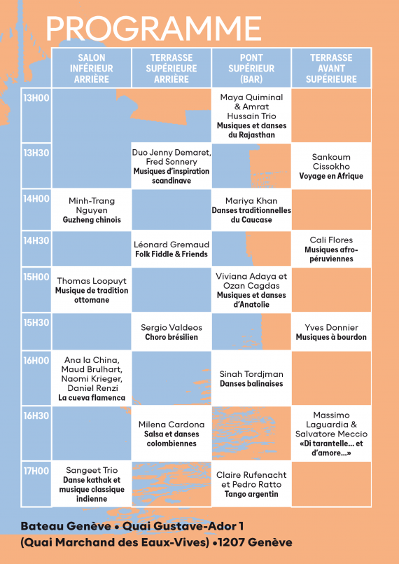 De 13h à 17h30, sur le Bateau-Genève, nous invitons à une déambulation du public et des artistes au fil des divers espaces du bateau, amarré quai Gustave Ador, lieu de promenade et de convivialité privilégié de la ville de Genève. Une trentaine d’artistes partageront leur passion par des mini concerts et spectacles d’une durée de 30 minutes chacun. Un rendez-vous musical à ne pas manquer !